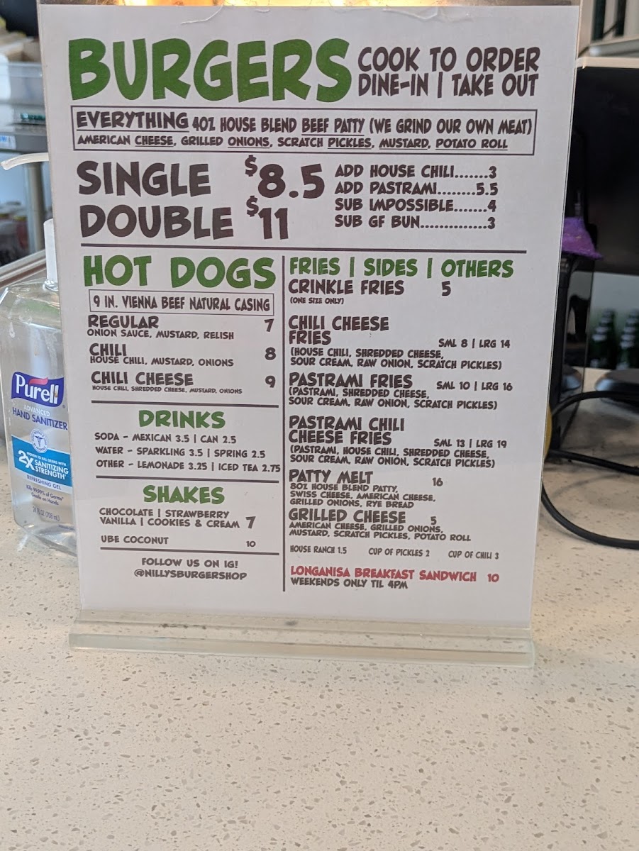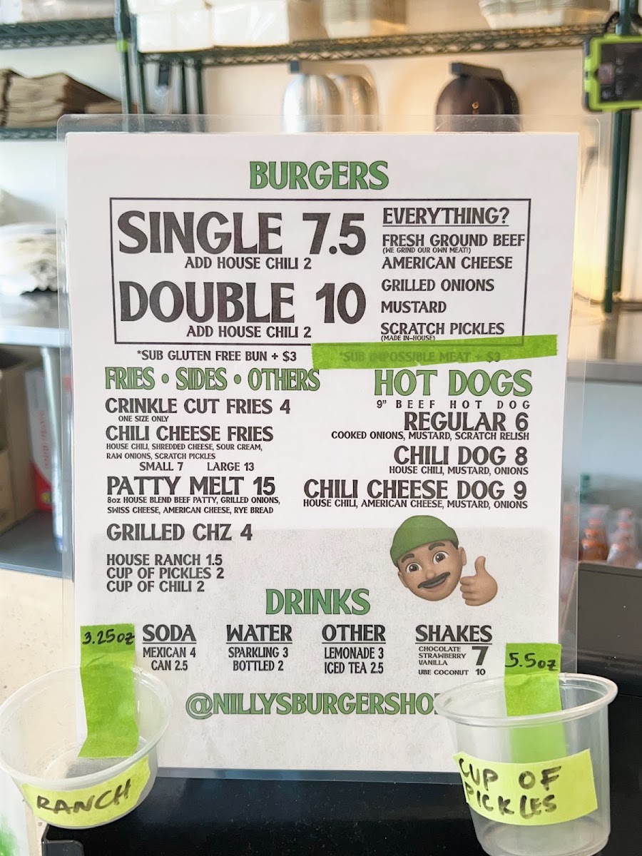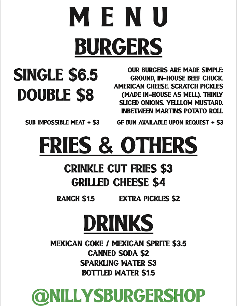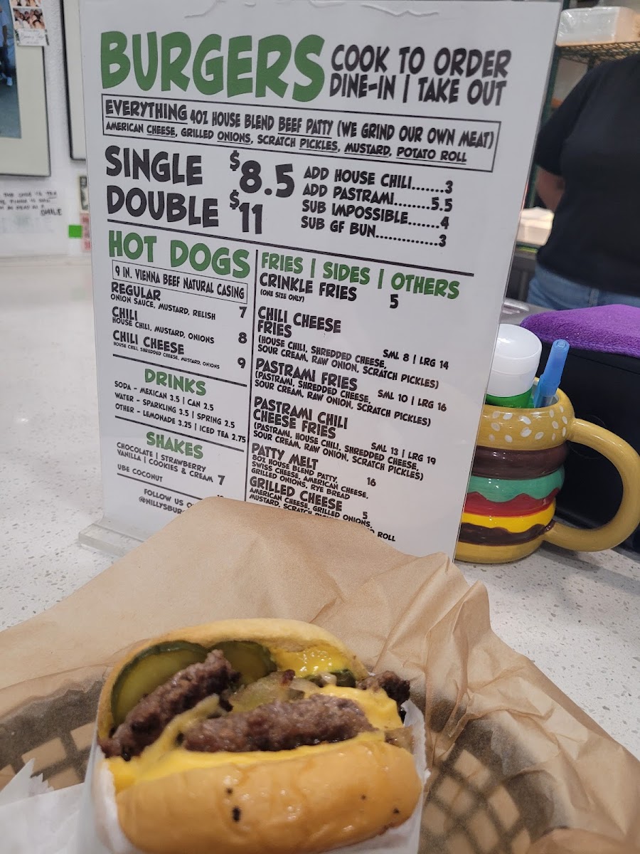 In-house, fresh ground beef, yellow american cheese, onions, scratch pickles, yellow mustard, in between martin's potato roll